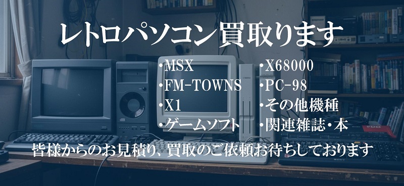 MSX、X68000、FM TOWNS、PC98、その他レトロパソコンの整理や処分にお困りなら、ぜひ当店の買取サービスをご利用ください。周辺機器、ソフトなども大歓迎です。